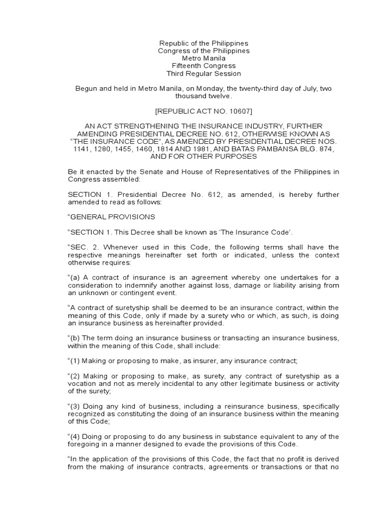 Amended Insurance Code Republic Act No 10607 Pdf Insurance Reinsurance